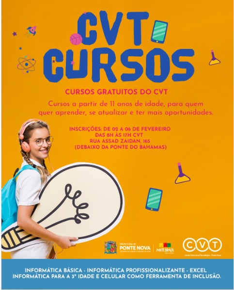 📢 ATENÇÃO, PONTE NOVA! Vem aí os cursos gratuitos do CVT – Centro Vocacional Tecnológico! 💻📱 Tem Digitação, Informática Básica, Informática Profissionalizante, Excel, Informática para