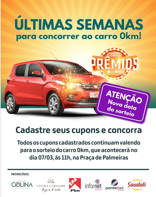 Atenção para a nova data do sorteio final da campanha Show de Prêmios: dia 7 de março (sábado), às 11h, na Praça de Palmeiras! Com