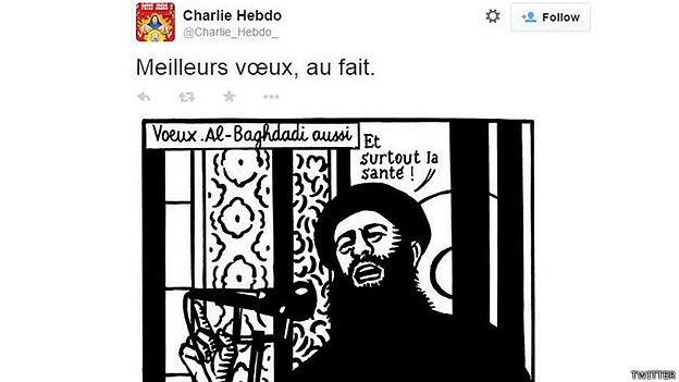 A mensagem traz uma charge que satiriza Abu Bakr al-Baghdadi, chefe do grupo extremista auto-proclamado Estado Islâmico, com a seguinte legenda: “Melhores votos. A você também, al-Baghdadi. E, principalmente, (votos) de saúde”. Não se sabe se há relação entre o ataque e a publicação do Twitter.
