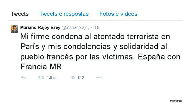 Pelo Twitter, o premiê espanhol, Mariano Rajoy, condenou o atentado em Paris.