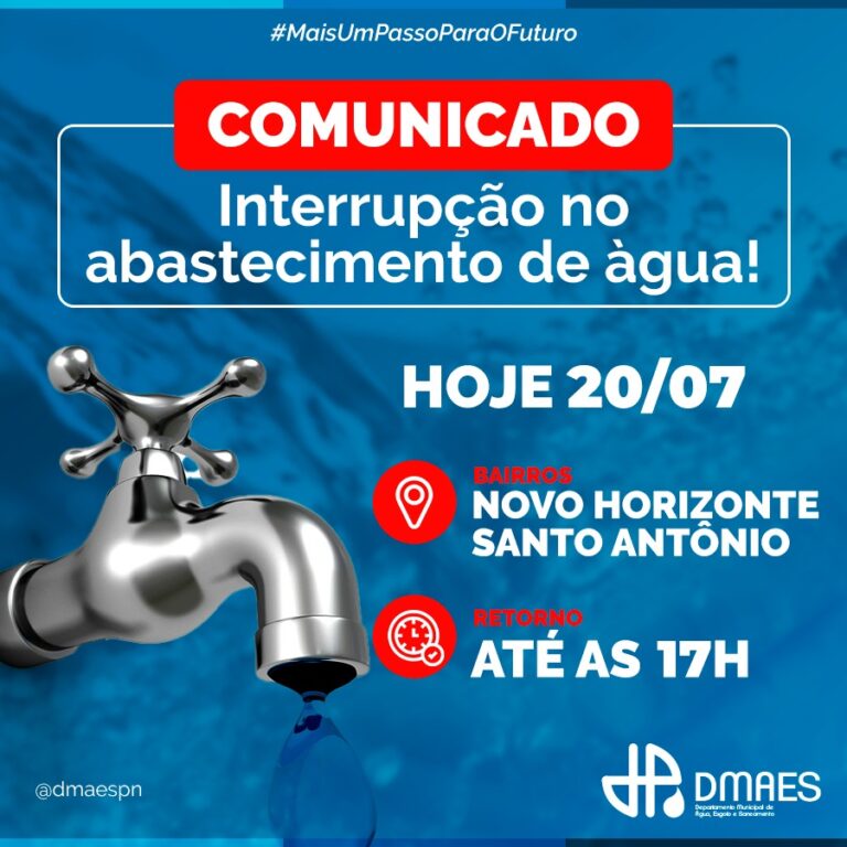 Comunicamos interrupção no abastecimento de água nos bairros Novo Horizonte e Santo Antônio, hoje 20/07. . Ambos são por problemas distintos, mas nossas equipes operacionais