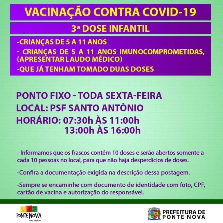 3ª DOSE PARA CRIANÇAS DE 5 A 11 ANOS. 🏥Ponto fixo as sextas-feiras, na sala de vacina do PSF Santo Antônio para vacinação da dose