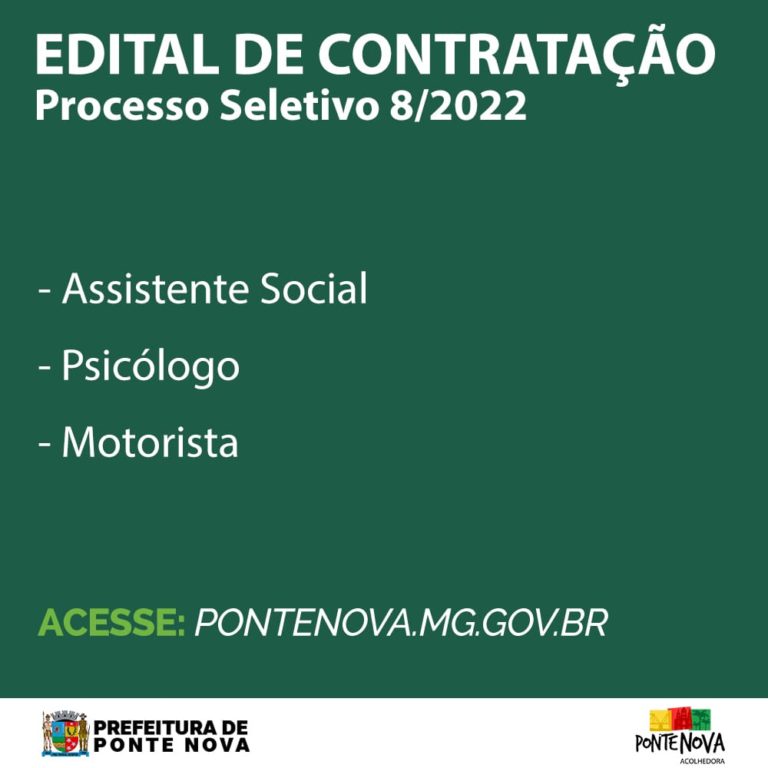 A prefeitura de Ponte Nova, através da Secretaria Municipal de Recursos Humanos, torna público que estarão abertas do dia 27/07/2022 ao dia 07/08/2022 as inscrições