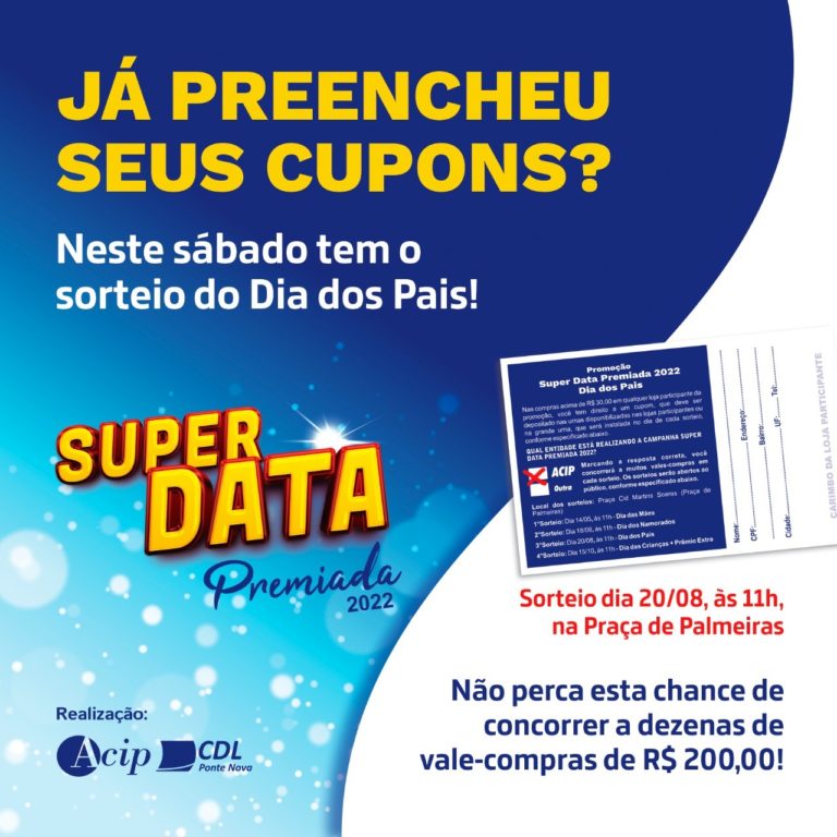O terceiro sorteio da Super Data Premiada 2022 está chegando! Será neste sábado (20/08), a partir de 11h, na Praça de Palmeiras. Alusivo ao Dia