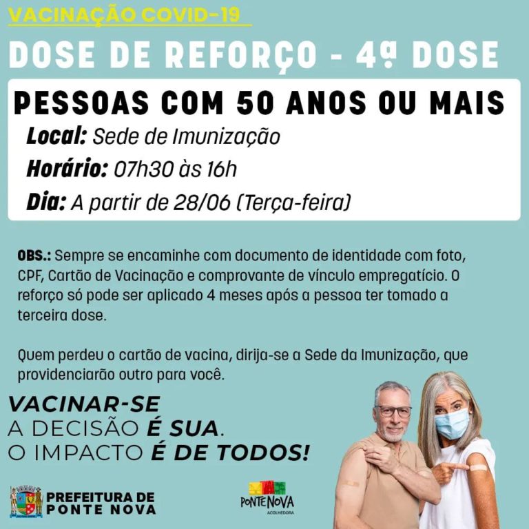 Veja na imagem data e horário da quarta dose para pessoas de 50 anos ou mais. A vacinação acontecerá na Sede de Imunização (ao lado