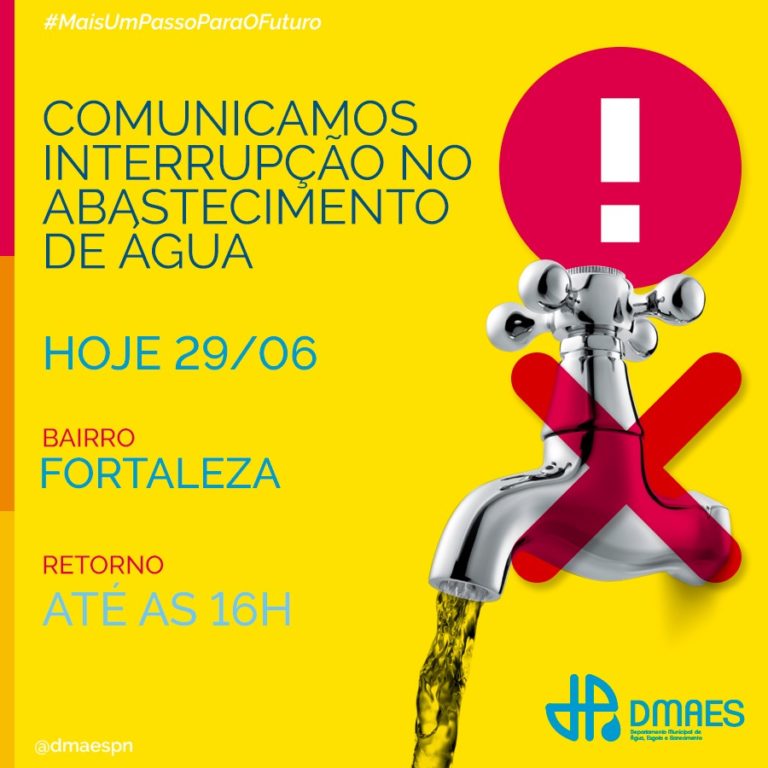 Comunicamos interrupção no abastecimetno de água no bairro Fortaleza, hoje 29/06. Nossa equipe operacional trabalha para conter vazamento no local, e a previsão de retorno