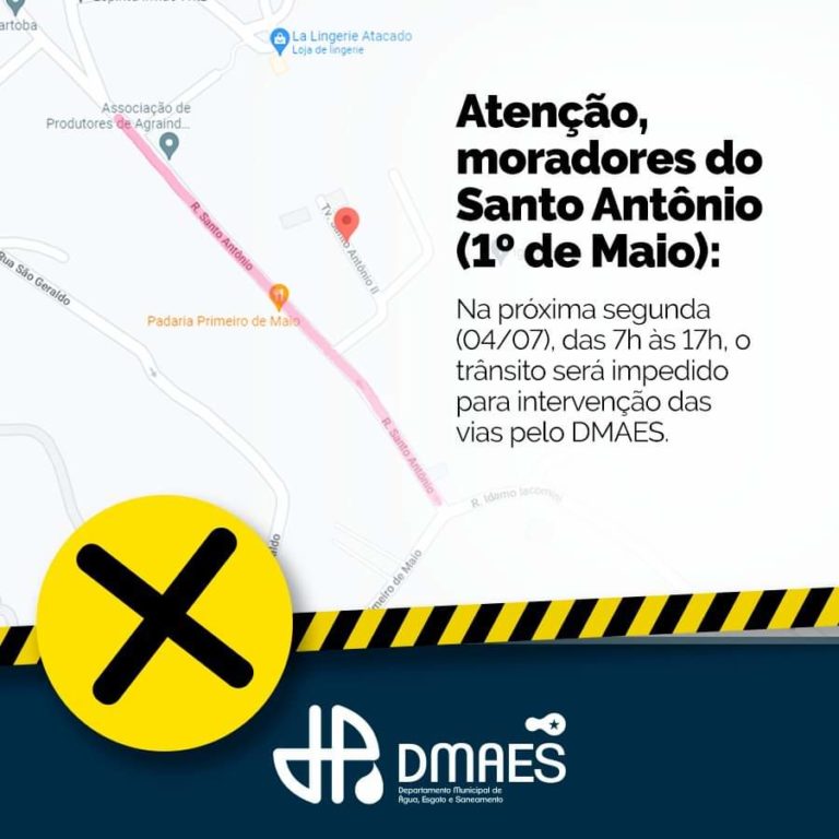 ATENÇÃO moradores e transeuntes do bairro 1º de Maio: na próxima segunda (04/07), equipe operacional do DMAES realizará obra em rede de esgoto da rua