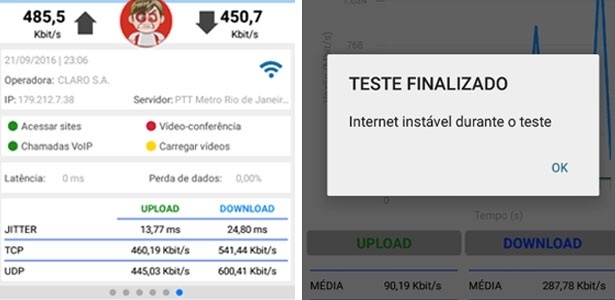 Com outro aplicativo, o Simet Mobile, avaliamos como ficam a latência e a velocidade de upload e download dessa rede Wi-Fi. Latência é o período de resposta da rede a um envio de dados: portanto quanto menor o valor, melhor. Os resultados também foram bons: de 13 a 24 milissegundos. Na velocidade de upload, foi de 445,03 Kbits/s a 460,19 Kbtis/s, enquanto na de download, mediu de 541,44 a 600,41 Kbits/s.