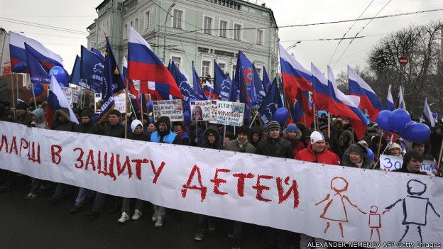 Mais recentemente, Moscou aprovou uma lei proibindo a adoção de crianças russas por americanos, devido a casos de abuso por parte de pais adotivos. No entanto, alguns viram isso como uma retaliação a uma sanção americana de 2012 aos abusos de direitos humanos na Rússia.