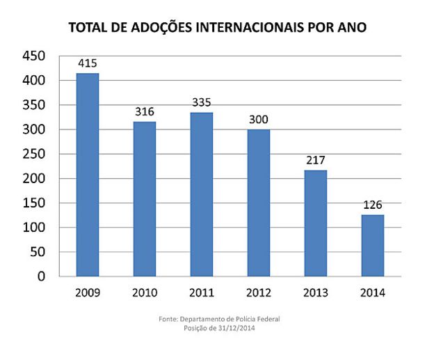 No Brasil também houve queda nas adoções de crianças brasileiras por famílias estrangeiras, segundo dados da Polícia Federal compilados pela Secretaria de Direitos Humanos da Presidência. Em 1999, o número de crianças adotadas por estrangeiros chegou a 452. Em 2014, caiu para o nível mais baixo: 126 crianças.
