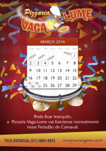 A Pizzaria Vagalume também entra na folia e vai funcionar no feriadão de Carnaval! Curta de montão o Carnaval e na hora de repor as