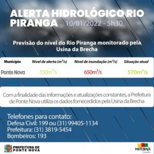 ATENÇÃO!BOLETIM DO MUNICÍPIO 10/01/2022 – 10h Confira as informações de previsão do Rio Piranga de acordo com o monitoramento da Usina da Brecha. A vazão