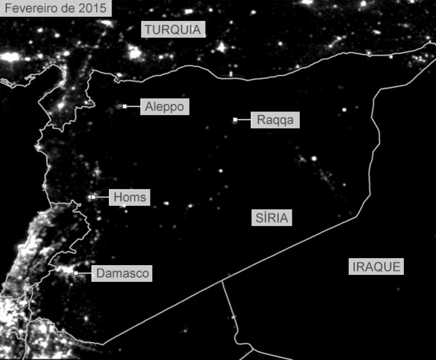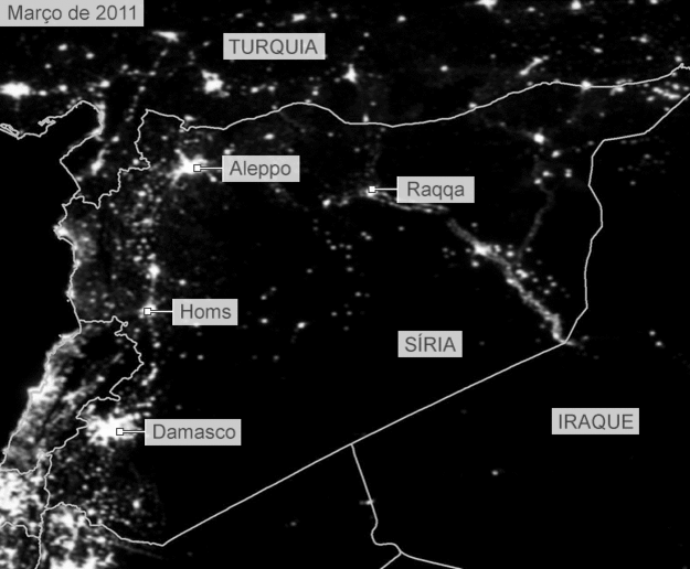 A coalizão WithSyria, formada por mais de 100 organizações humanitárias, divulgou imagens de satélite mostrando que o número de luzes diminuiu dramaticamente desde março de 2011.